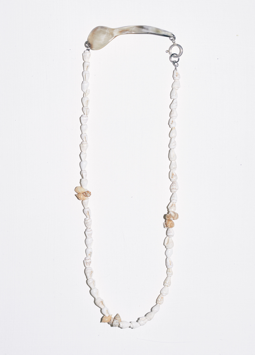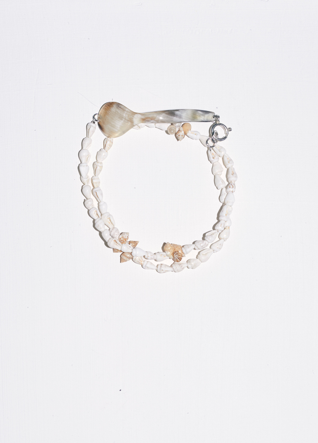 Le bracelet/collier PARAGGI BLANC est composé d’une cuillère en corne de zébu, provenant de Madagascar, achetée en seconde main. Elle a été tordue à Paris par un artisan.