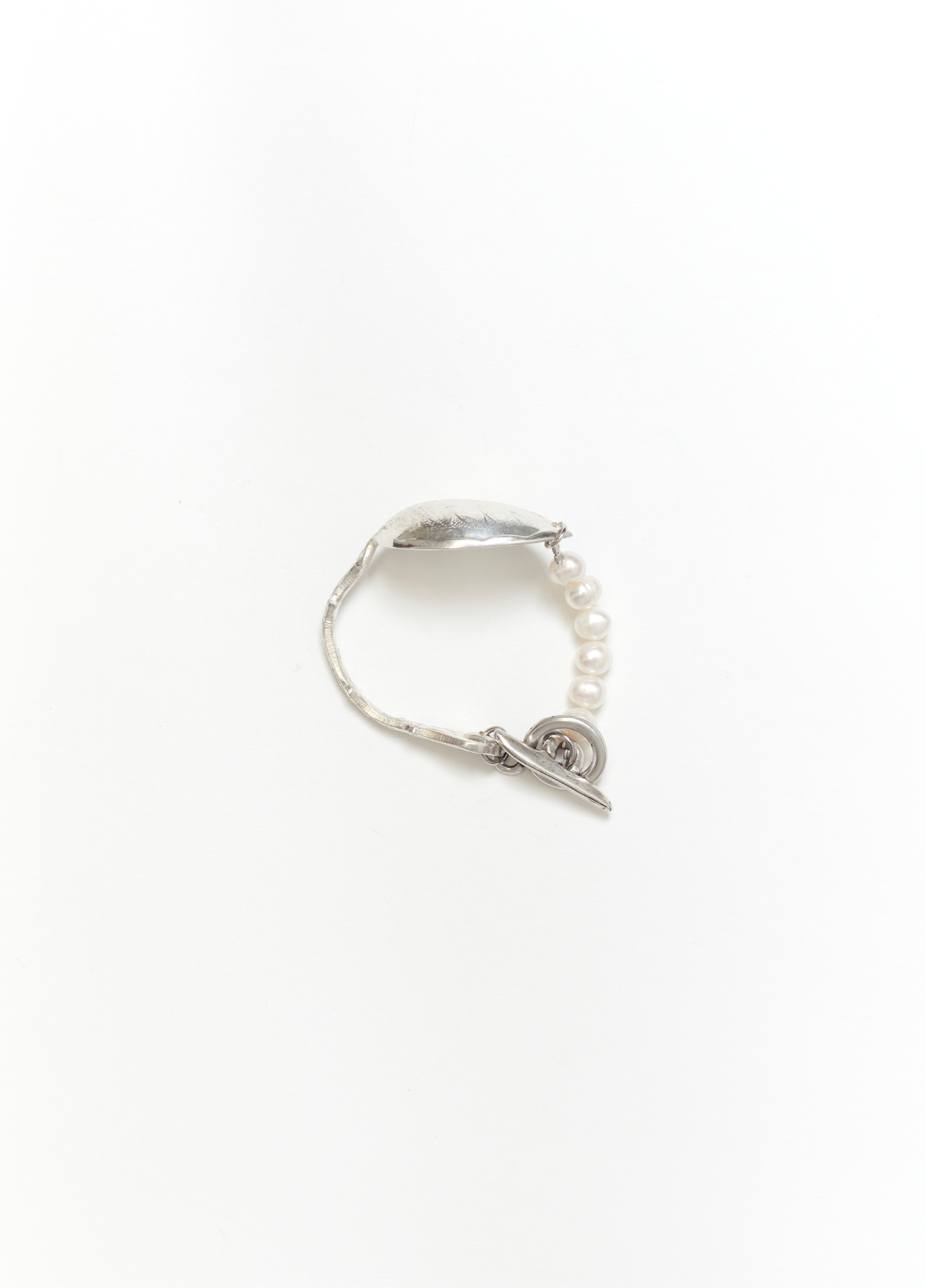 Le bracelet LECCE est composé d’une cuillère ancienne en argent style feuille provenant et de perles nacrées vintage.