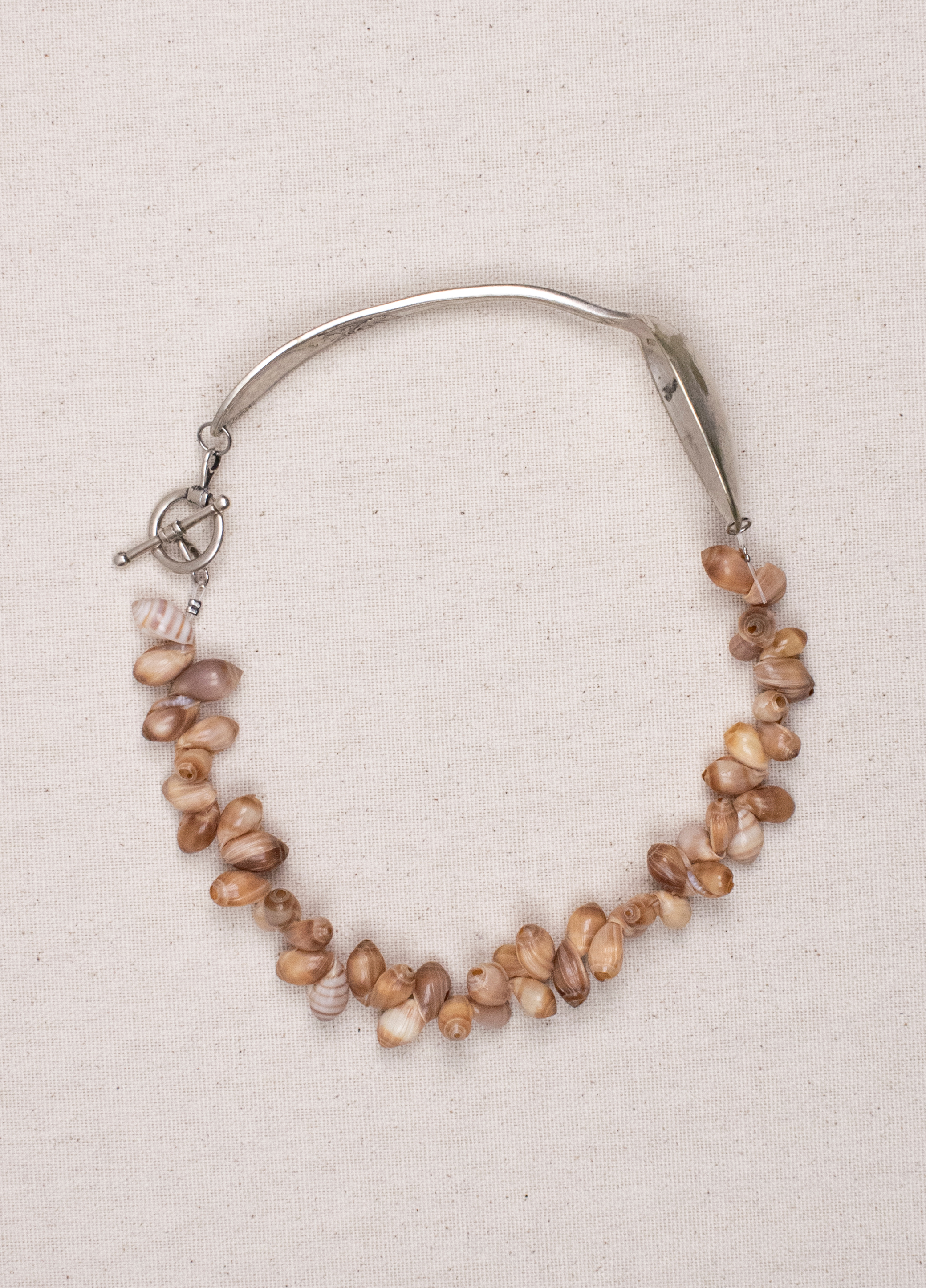 Le collier Ancône est composé d'une cuillère ancienne en argent et de coquillages vintage de Tahiti.