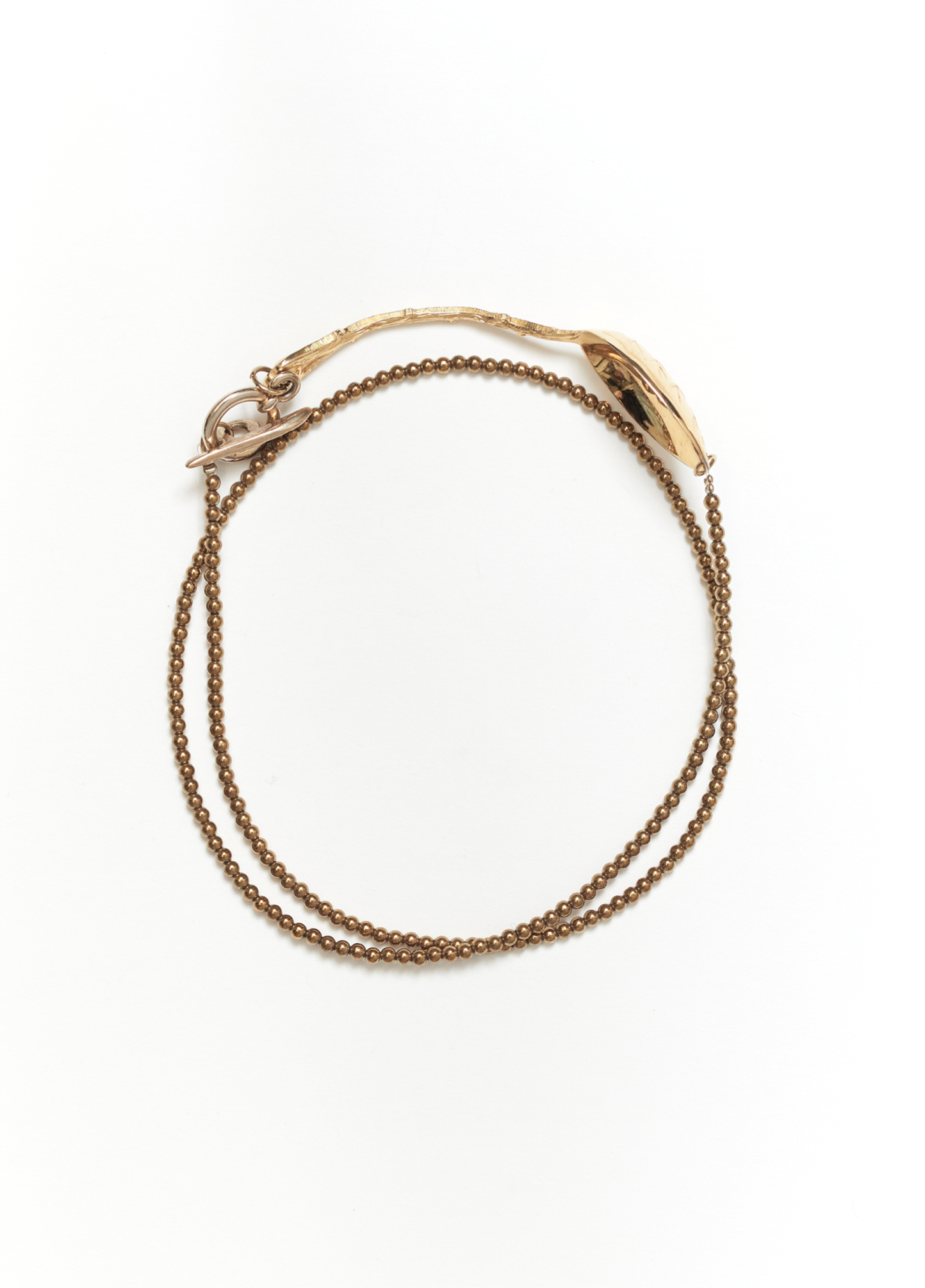 Le collier CIVITAVECCHIA est composé d’une cuillère ancienne plaqué or, style feuille et de petites perles semi-précieuses hématites couleur dorées.