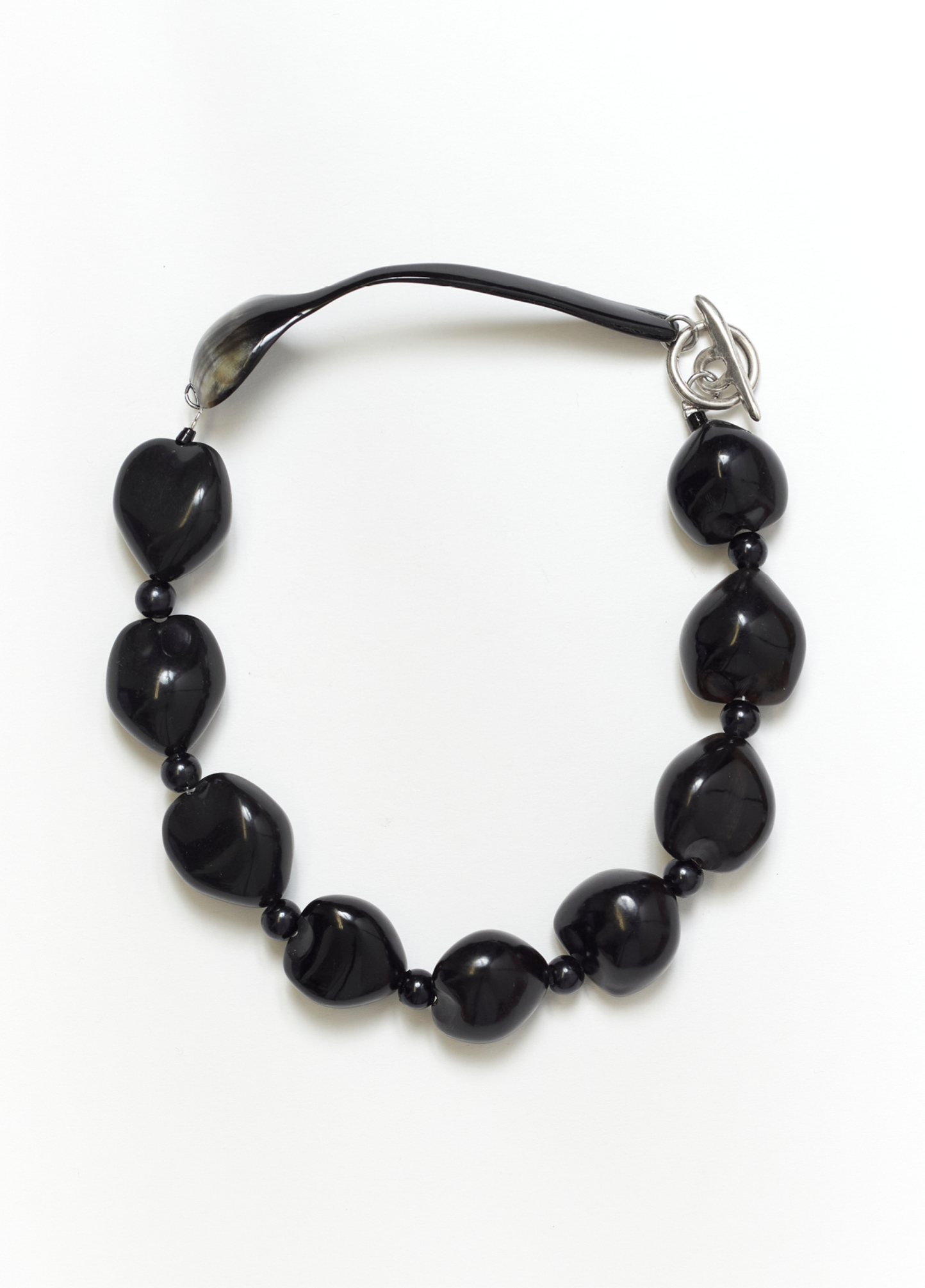 Le collier ERCOLANO noir est composé d’une cuillère en corne de zébu provenant de Madagascar achetée en seconde main. Elle a été tordue à Paris par un artisan.