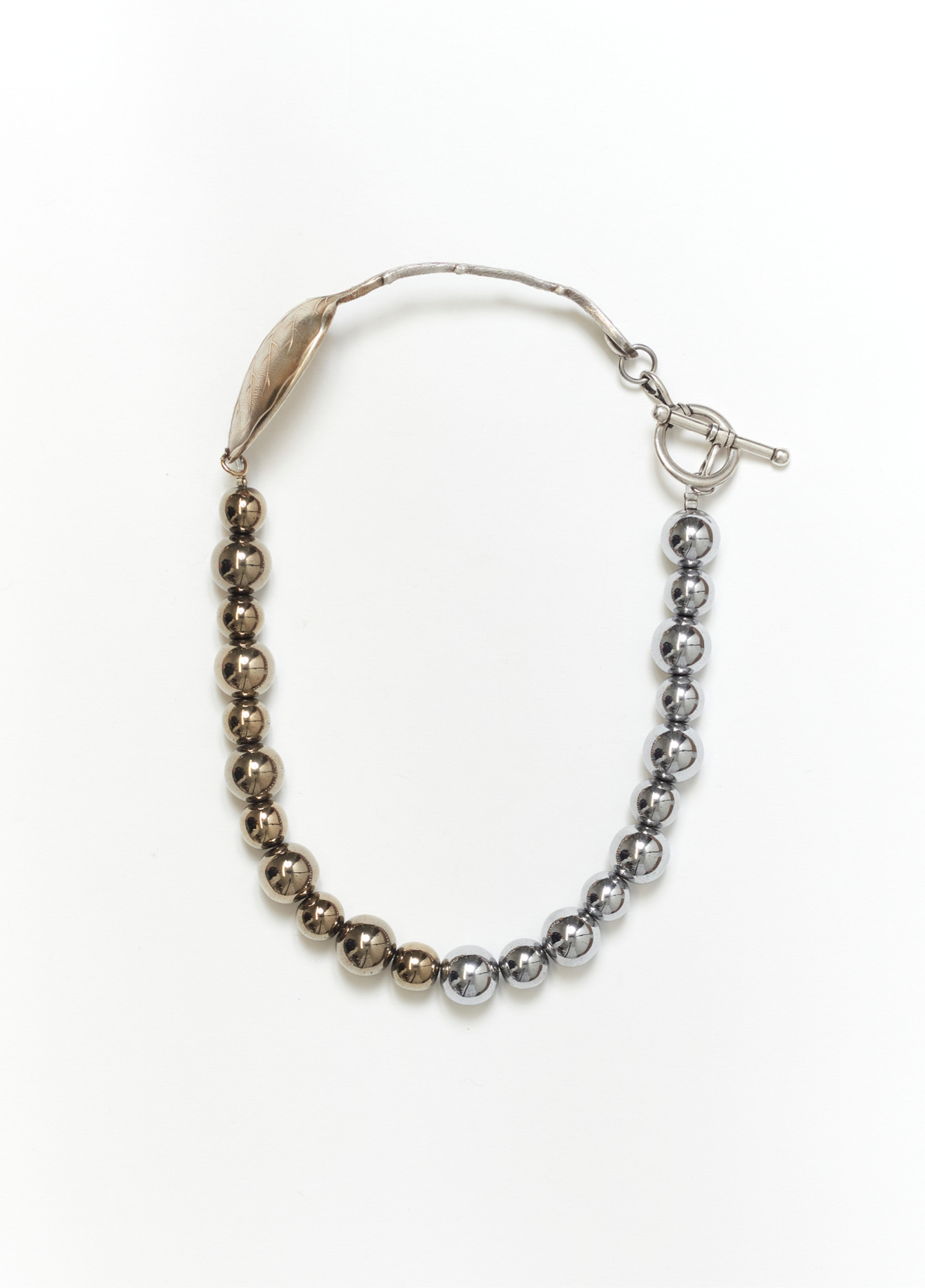 Le collier GROSSETO BICOLORE est composé d’une cuillère ancienne bicolored plaqué or et argent et de perles semi-précieuses hématites couleur argenté/doré.
