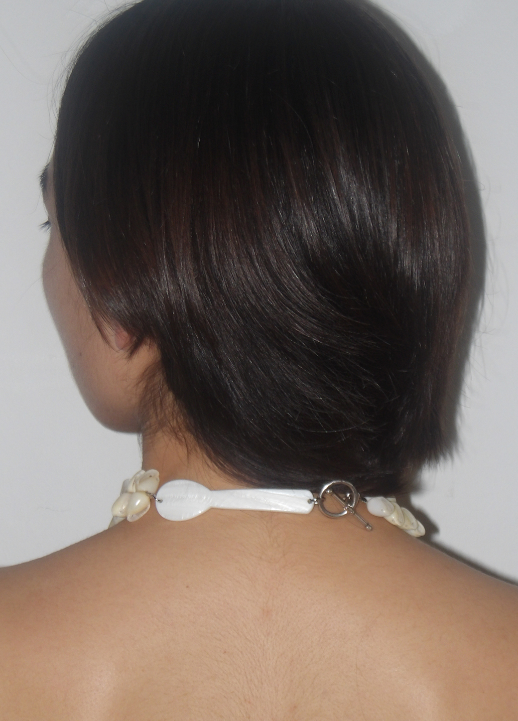 Le collier MARIOLU est composé d’une cuillère à caviar en nacre et de coquillages écru vintage.