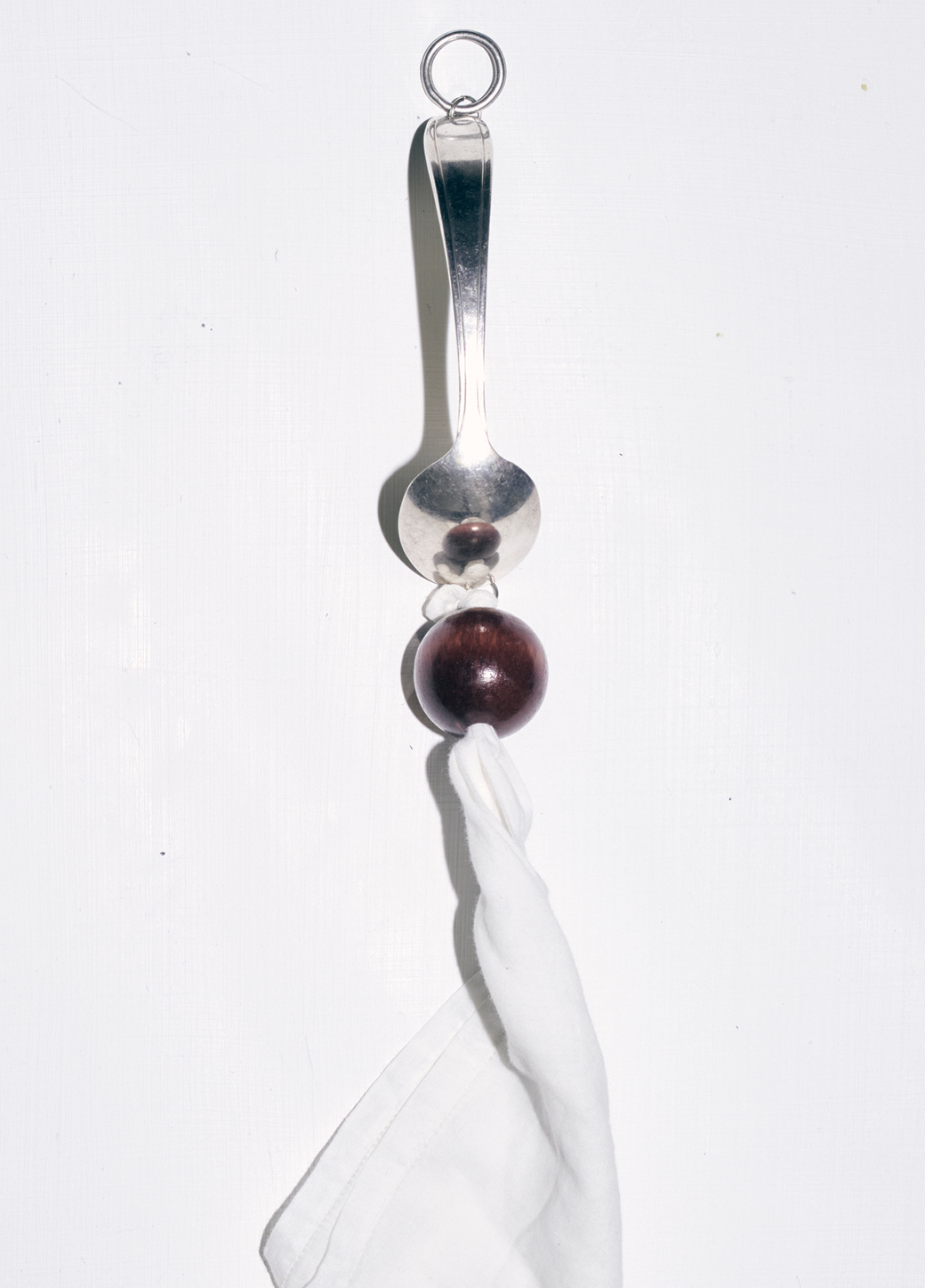 Le collier ZAGARE est composé d’une cuillère en argent avec un petit mouchoir ancien en coton et une perle en bois vintage.