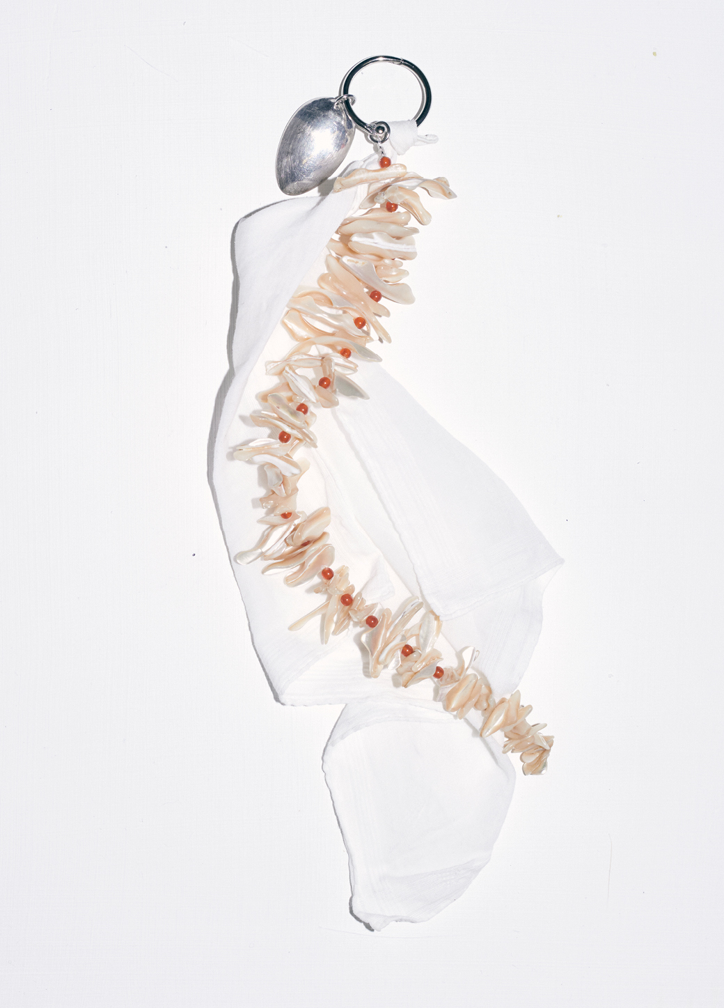 Le porte-clé RICCIONE est composé d’une tête de cuillère en argent, d’un petit mouchoir ancien en coton blanc et d’une chaîne de perles nacrées vintage.