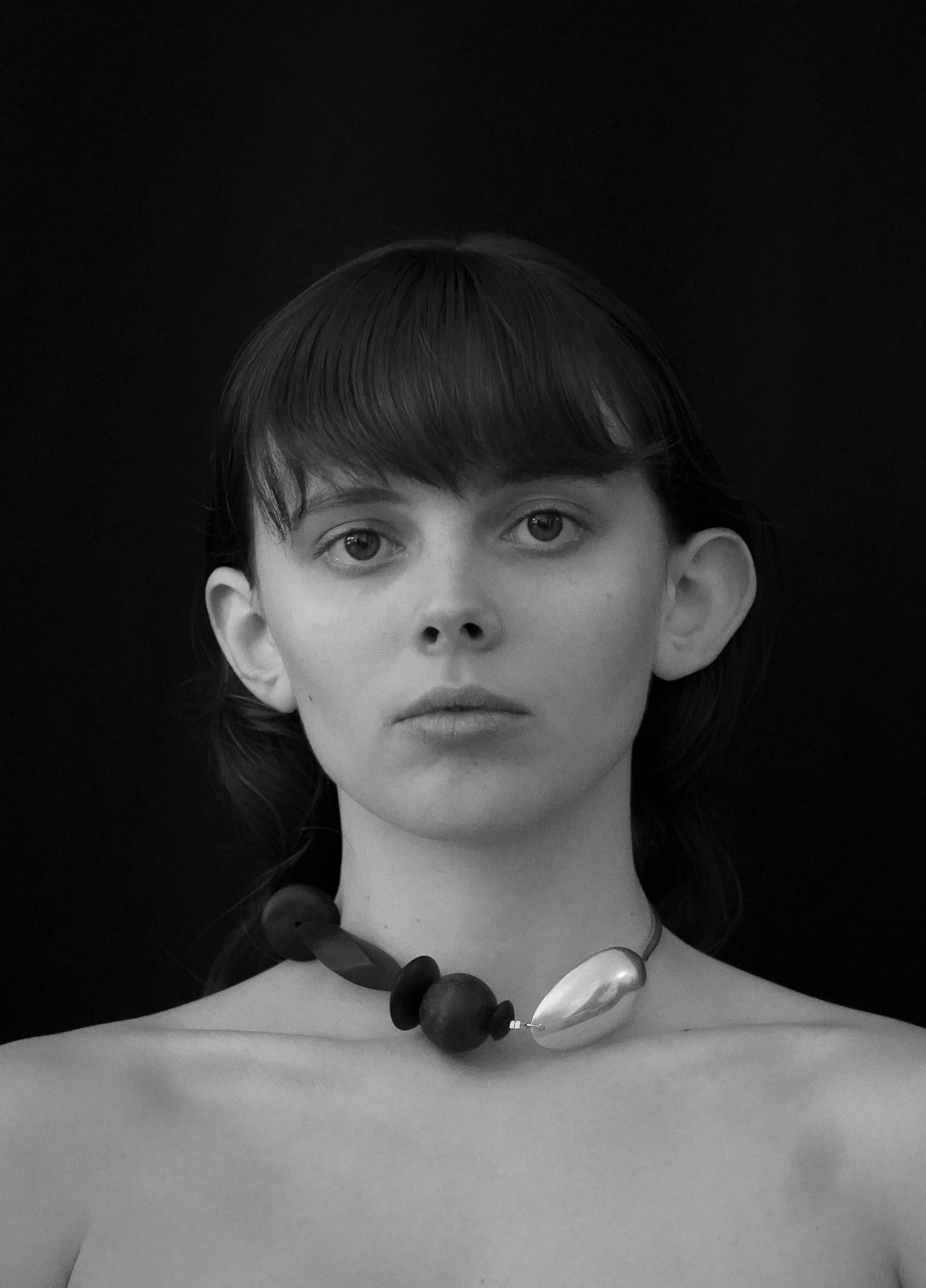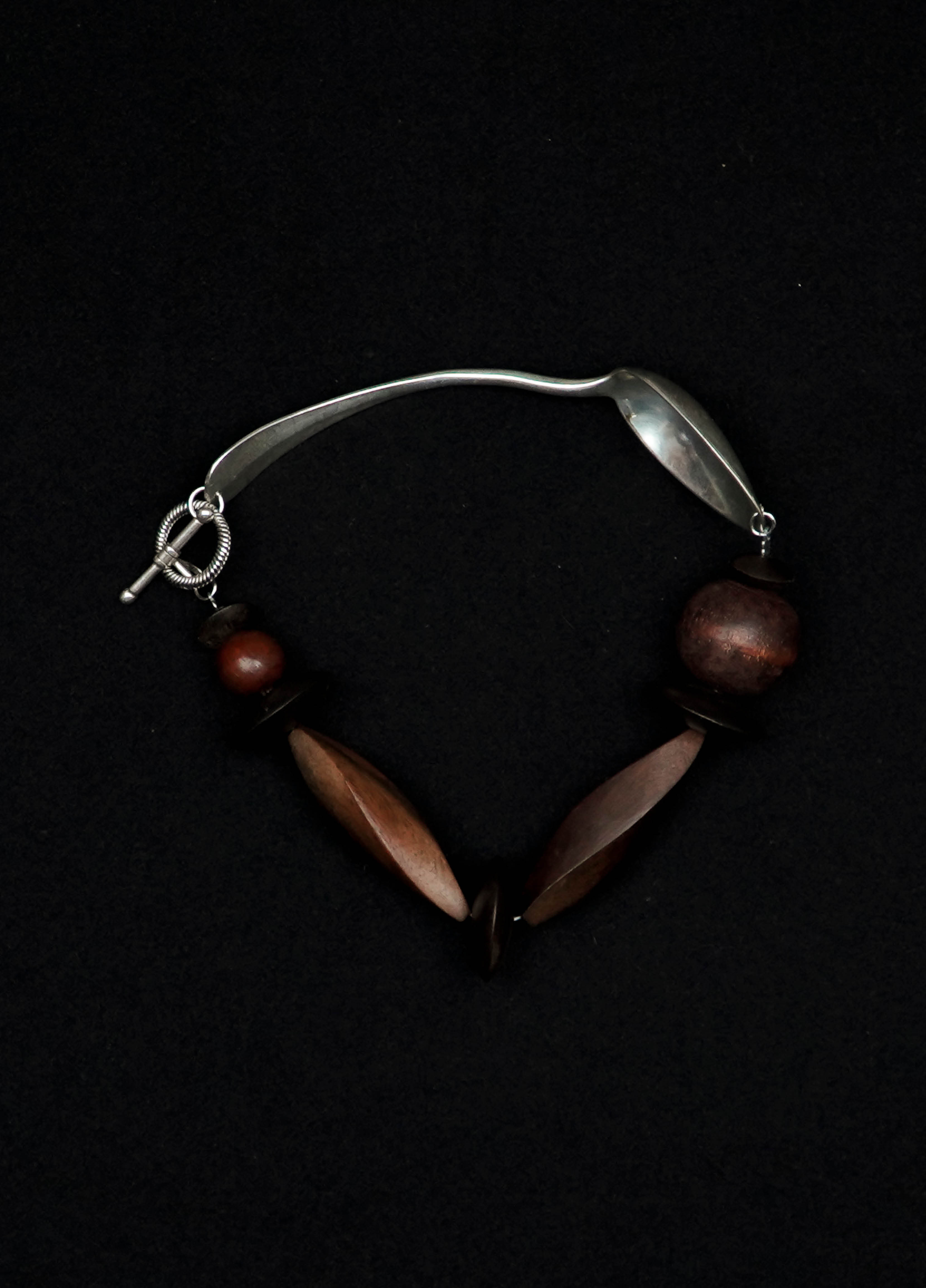 Le collier CONI est composé d’une cuillère ancienne en argent et de perles vintage en bois.