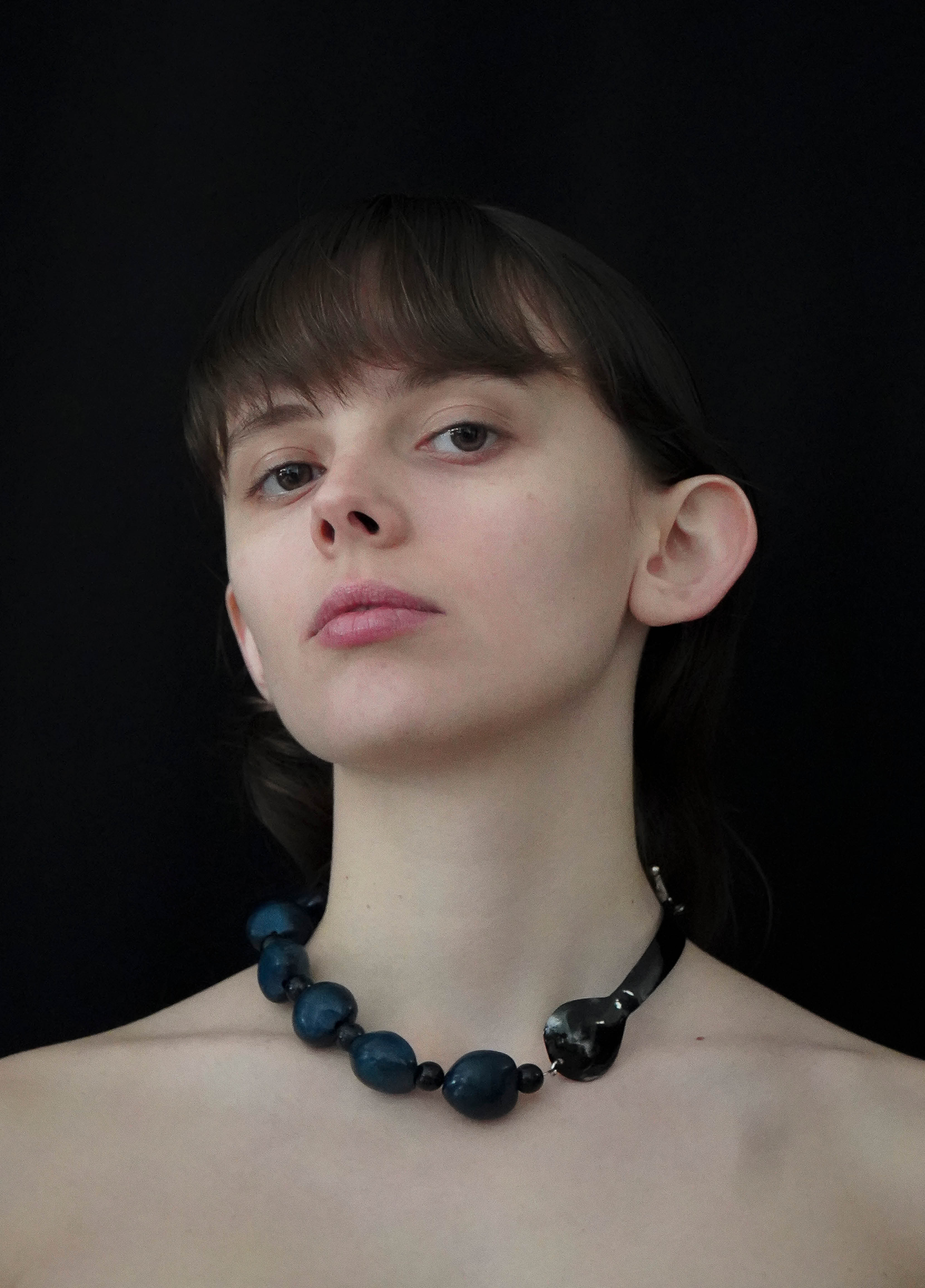 Le collier ERCOLANO bleu est composé d’une cuillère en corne de zébu provenant de Madagascar achetée en seconde main. Elle a été tordue à Paris par un artisan.